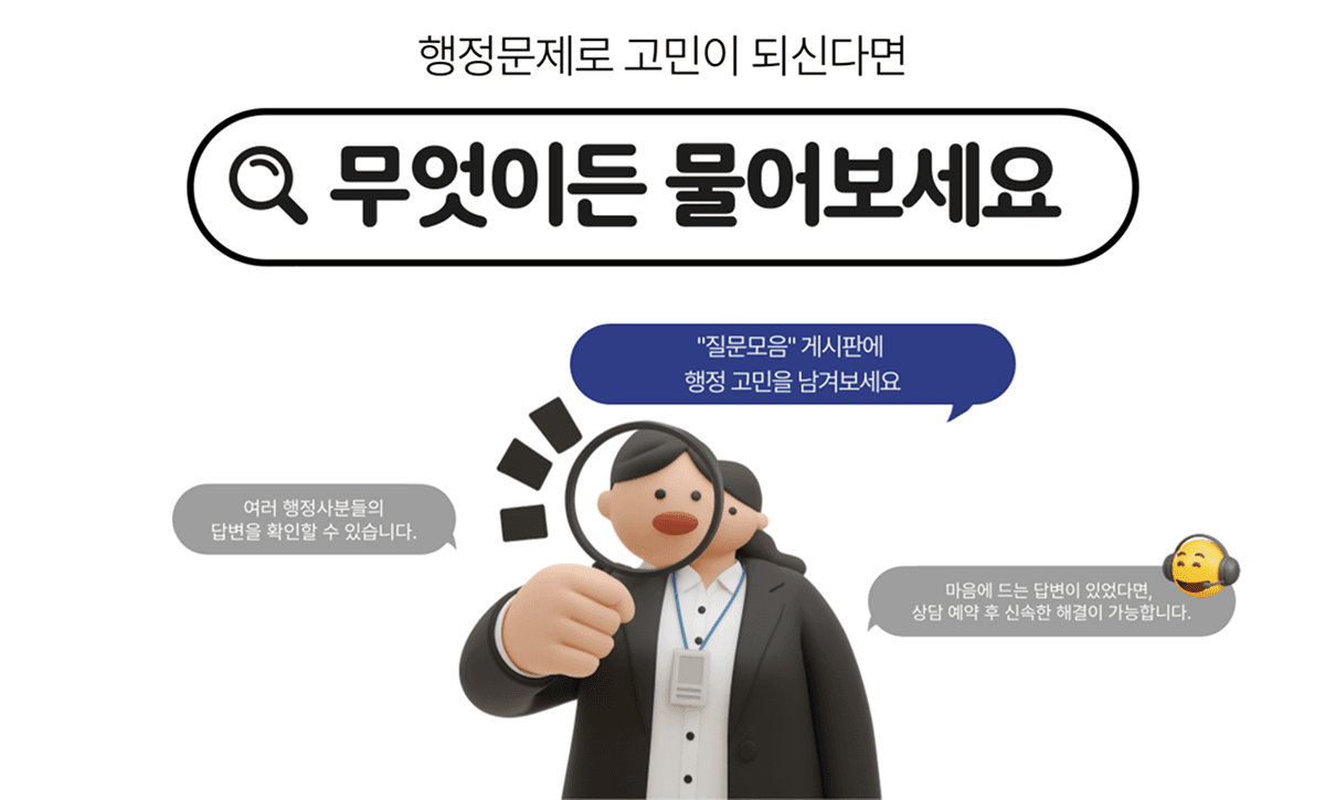 행정 문제로 고민 중이시라면 질문 게시판을 이용해 보세요. 나만의 행정사 질문 게시판은 이용자가 가진 행정 관련 고민을 자유롭게 올릴 수 있는 공간입니다. 게시판에 질문을 남기면 여러 행정사가 직접 답변을 남기며, 당신의 상황에 맞는 구체적인 조언과 해결 방향을 제시합니다. 답변을 확인하고 마음에 드는 행정사를 선택한 뒤, 상담 예약까지 바로 진행할 수 있습니다. 복잡한 과정 없이, 질문부터 상담까지 나행에서 한 번에 해결하세요.