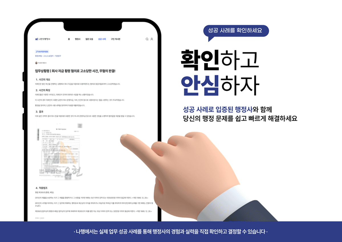 '이 행정사가 정말 잘할까?'라는 의문이 드시나요? 나행에서는 행정사의 실제 업무 성공 사례를 투명하게 공개합니다. 행정사가 처리한 실제 업무 사례, 해결 과정, 고객 만족도 등의 정보를 확인할 수 있어 행정사의 전문성과 경험을 직접 확인할 수 있습니다. 성공으로 입증된 행정사와 함께라면, 당신의 문제도 더 빠르고 확실하게 해결할 수 있습니다.