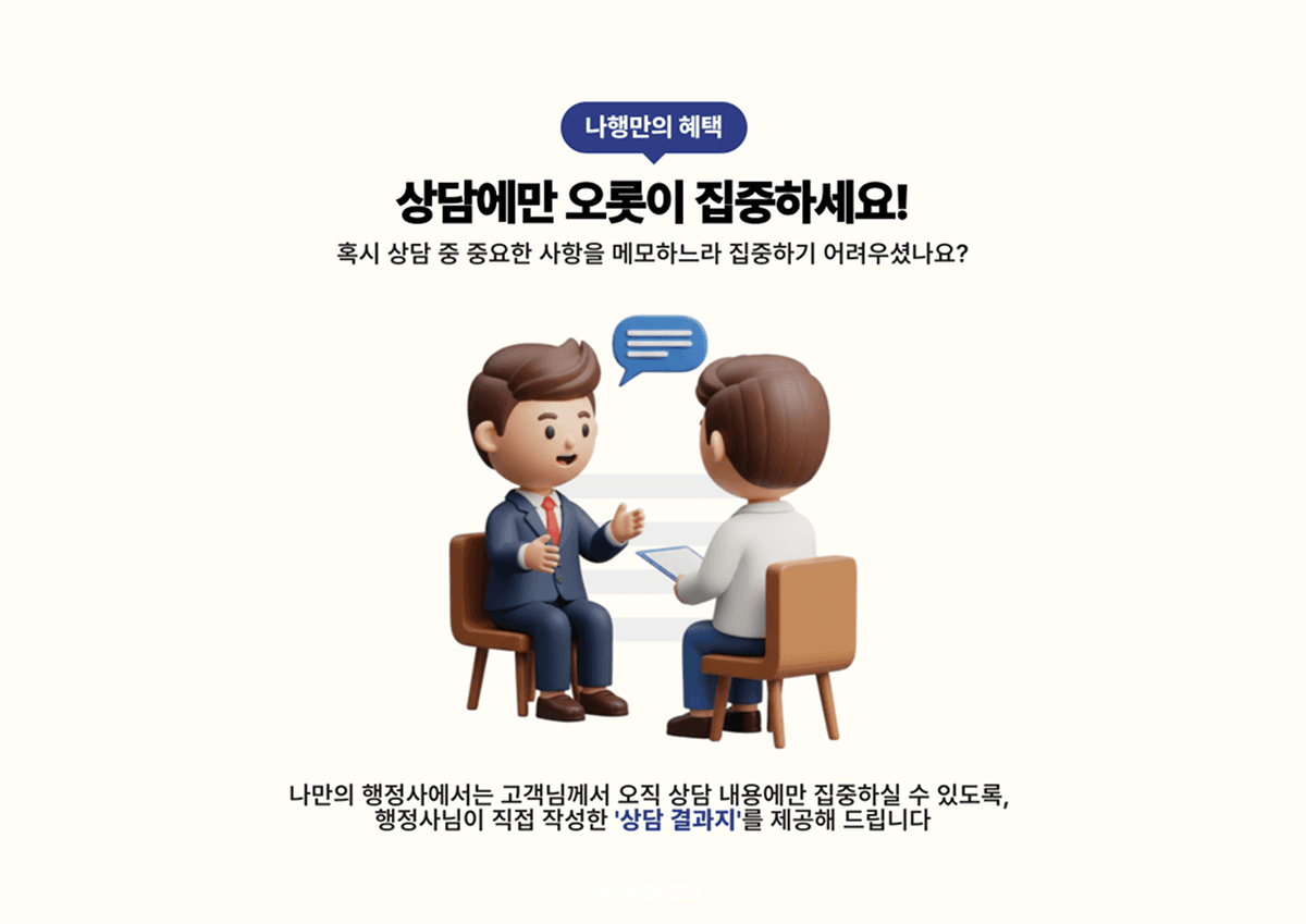 상담 중 중요한 내용을 놓칠까 메모하느라 바빴던 경험, 한 번쯤 있으시죠? 이제는 그런 걱정하지 마세요. 나행에서는 상담이 끝난 후, 행정사가 직접 상담 내용을 요약한 상담결과지를 제공합니다. 이 결과지에는 상담 요약, 제안된 해결 방향, 필요한 서류나 절차 등이 체계적으로 정리되어 있어 이용자가 이후 절차를 진행할 때 실질적인 도움이 됩니다. 무엇보다, 행정사는 상담결과지를 제출해야만 정산이 이뤄지기 때문에, 이용자는 꼼꼼하고 신뢰할 수 있는 상담을 보장 받습니다.